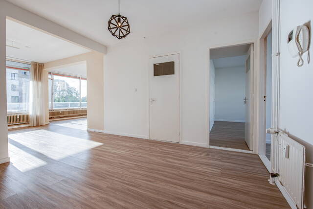 Entree van het appartement in een ruime centrale hal met meterkast. De lichte en royale woon-/eetkamer heeft grote raampartijen en biedt toegang tot het balkon op het zonnige zuidwesten. Aan de voorzijde bevinden zich twee slaapkamers: een ruime hoofdslaapkamer en een tweede, kleinere kamer – ideaal als werkkamer, kinderkamer of walk-in closet.