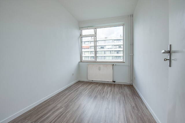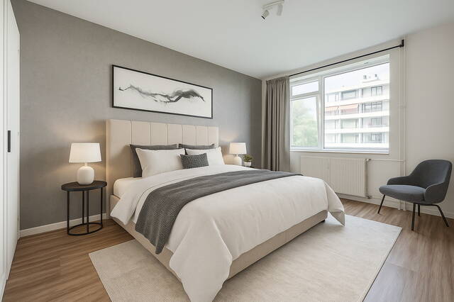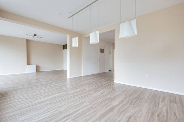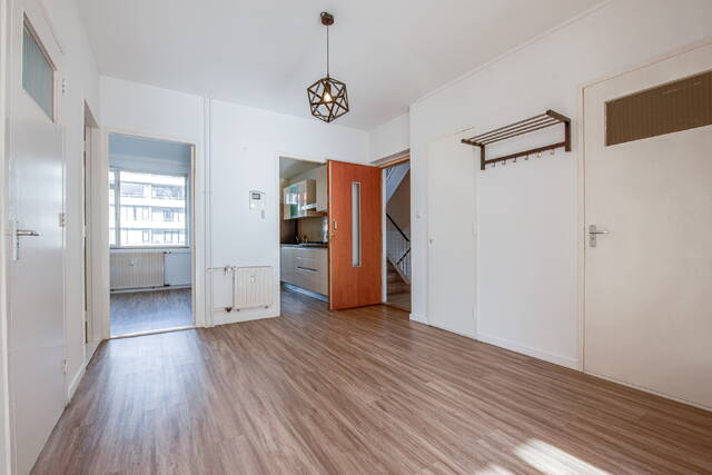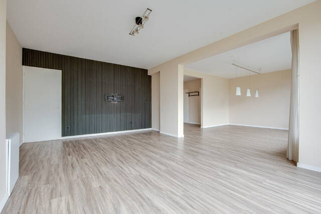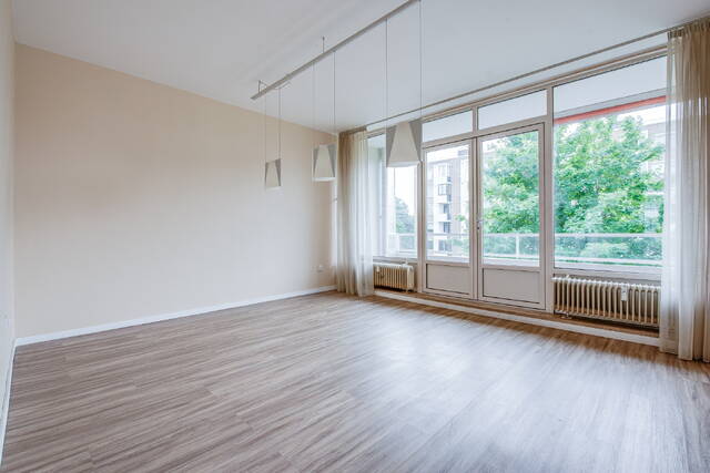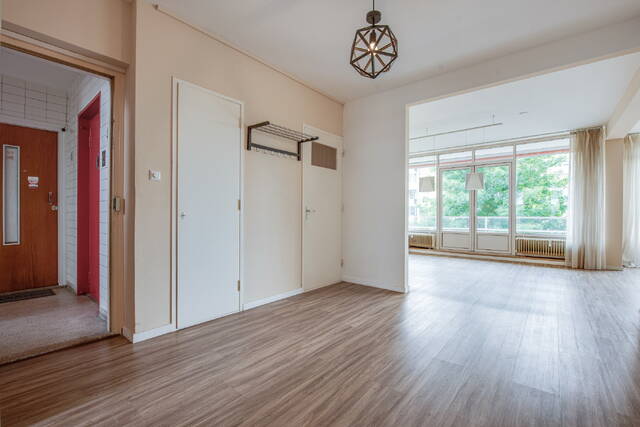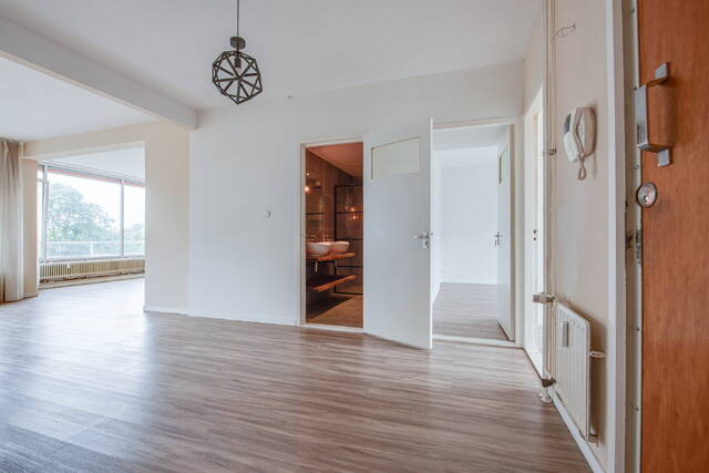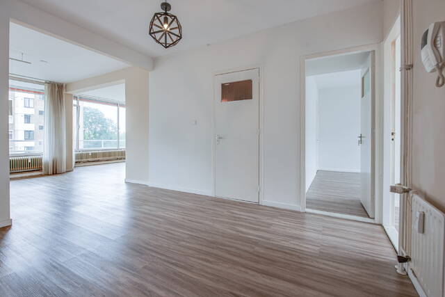 Entree van het appartement in een ruime centrale hal met meterkast. De lichte en royale woon-/eetkamer heeft grote raampartijen en biedt toegang tot het balkon op het zonnige zuidwesten. Aan de voorzijde bevinden zich twee slaapkamers: een ruime hoofdslaapkamer en een tweede, kleinere kamer – ideaal als werkkamer, kinderkamer of walk-in closet.