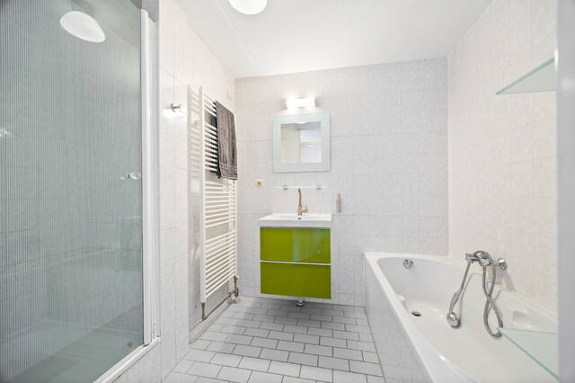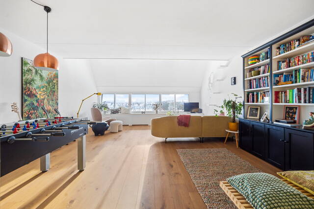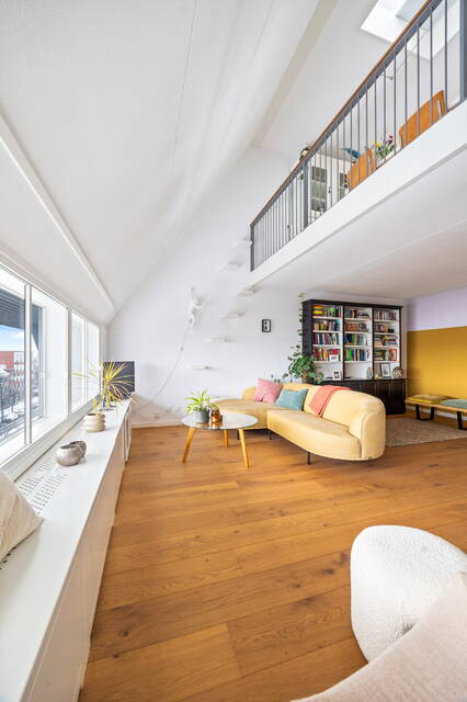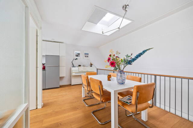 A closed wooden staircase leads to the fifth-floor landing. Adjacent to a skylight, the landing is extra bright. At the front of the landing is a spacious living room (35m²) with full-width windows. The two bedrooms, 12m² and 9m² respectively, are located at the rear. Adjacent to the landing are a second toilet with a small sink, and a bathroom with a shower, double bathtub, and a washbasin with matching vanity and radiator. The under-stairs cupboard houses the central heating/heat recovery system and a washer/dryer. There is also a spacious walk-in closet.