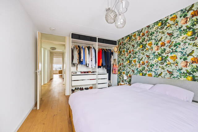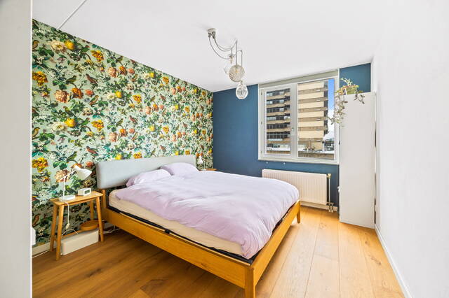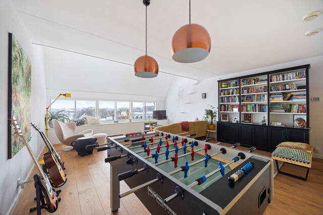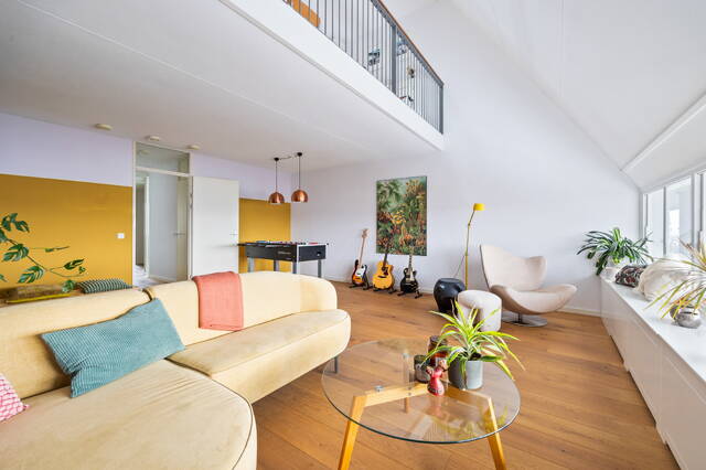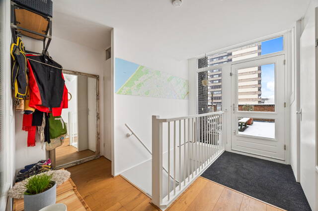Playfully spacious three- or four-room TOP apartment with eat-in kitchen, loft, spacious roof terrace, indoor parking space, and private storage. This beautifully laid-out two-story three- or four-room apartment of 113m² is located on one of the most beautiful access roads to the center of The Hague. Characteristic of this "top" apartment, part of the Hofappartementen Prinsegracht project (1998), is the spacious roof terrace and the entrance with eat-in kitchen on the sixth floor. The roof terrace of no less than 29m² offers unobstructed and beautiful views of, among other things, the garden of the Hofje van Nieuwkoop and the skyline of The Hague. Due to its prime location, the terrace is bathed in sunshine all day long. The eat-in kitchen, thanks to an open space (loft), offers a view of the living area below, accessible via an internal staircase. This living area includes the living and bedrooms.