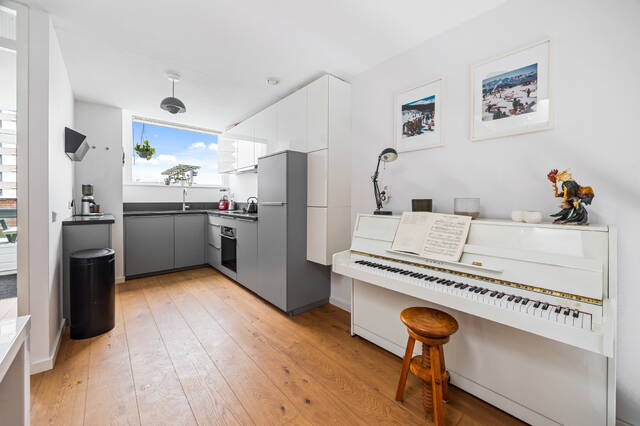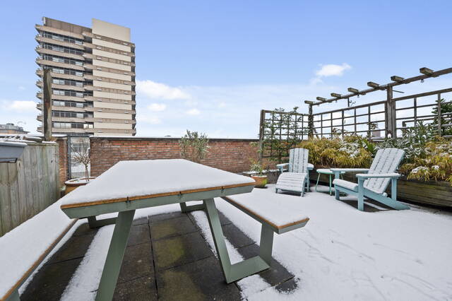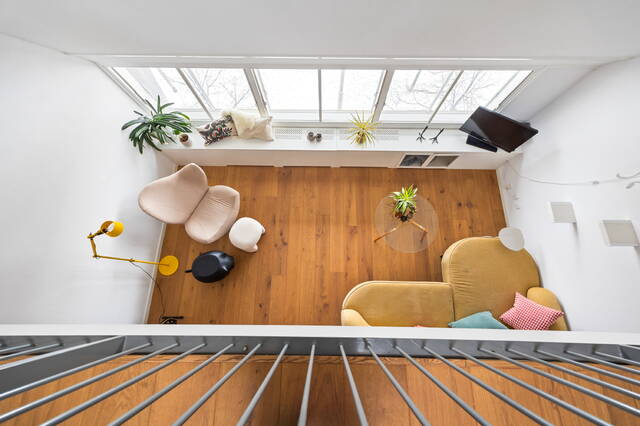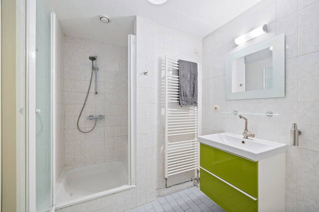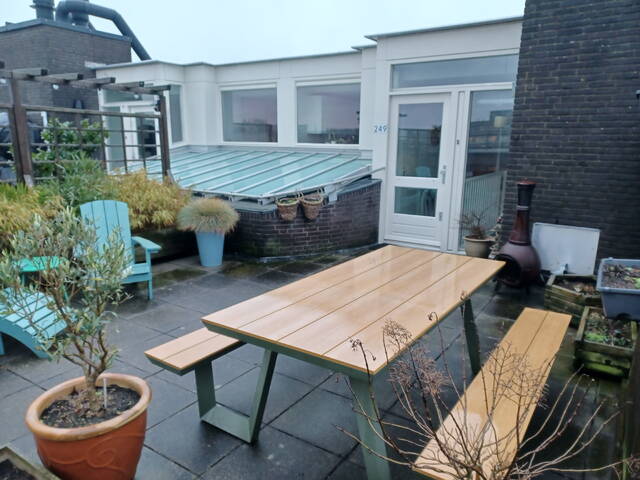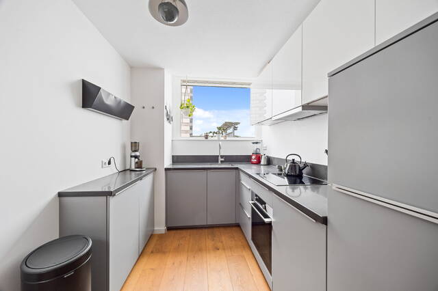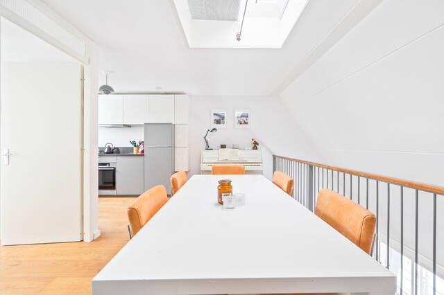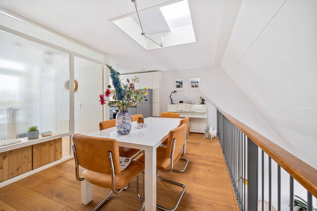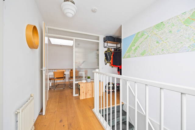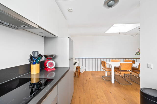 The apartment is located on the top floor. The spacious 29m² roof terrace offers beautiful views of the adjacent Hofje van Nieuwkoop and The Hague (the skyline). The roof terrace provides access to a vestibule with the meter cupboard and a spacious 20m² kitchen-diner located on the adjacent mezzanine. The open-plan kitchen is equipped with a 4-burner induction cooktop with extractor hood, oven, refrigerator and freezer (3 drawers), and dishwasher. A skylight provides extra light and offers a view of the living room below. Furthermore, there is a toilet with a washbasin on this floor.