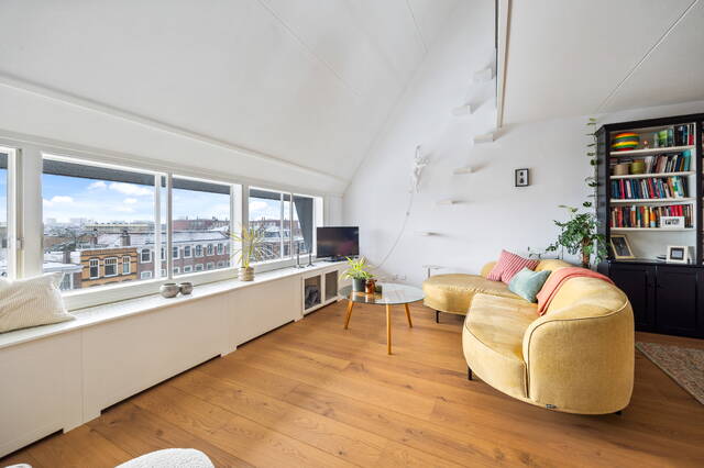 Een dichte houten trap geeft toegang tot de overloop op de vijfde verdieping. Grenzend aan een lichtkoof is de overloop extra licht. Aan de voorzijde ervan bevindt zich een ruime woonkamer (35m²) met over de volle breedte raamkozijnen. De twee slaapkamers, resp. 12m² en 9m² bevinden zich aan de achterzijde. Verder grenzen aan de overloop een tweede toilet met fonteintje, badkamer- voorzien van douchecabine, llgbad en wastafel met bijbehorend meubel en radiator, In de trapkast is ruimte voor de cv/wtw installatie en wasmachine/droger. Verder is er nog een ruime inloopkast aanwezig.