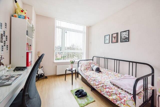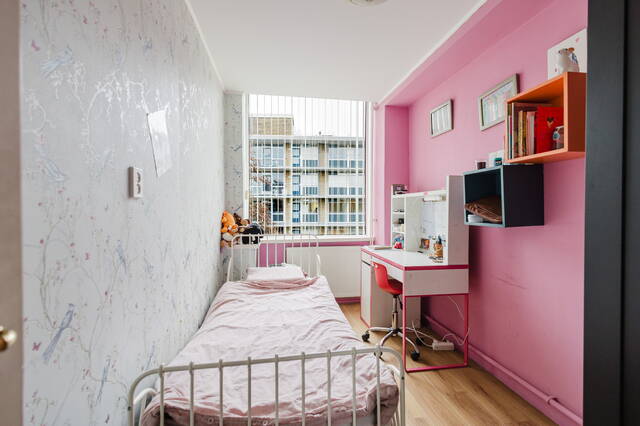 De tweede slaapkamer (10m²) is gelegen aan de voorzijde van het appartement. Deze lichte kamer is uitstekend geschikt als kinderkamer of logeerkamer.