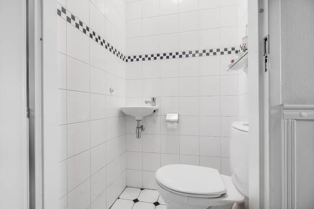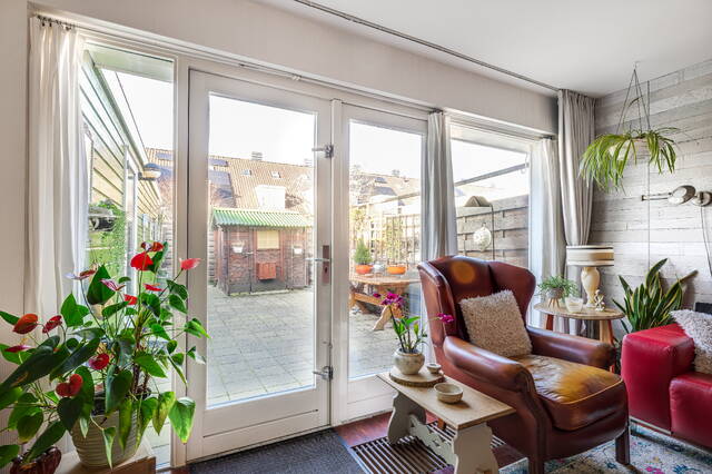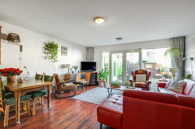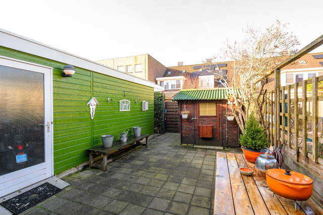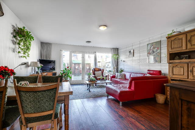 The deep front garden, located on the southeast, provides access to the entrance. Through the spacious hallway you reach the meter cupboard, the fully tiled toilet with washbasin, the staircase to the first floor, and the bright living room. The kitchen is located at the front of the house and is equipped with a six-burner gas stove with extractor hood, oven, dishwasher, and double sink. From the kitchen, you also have access to the front garden through French doors, where you can enjoy the sun. Through a second set of French doors in the living room, you reach the back garden. This garden is located on the northwest and features two storage sheds and a rear entrance.