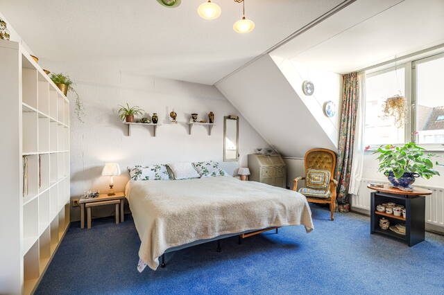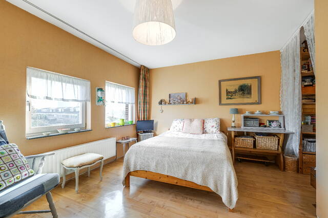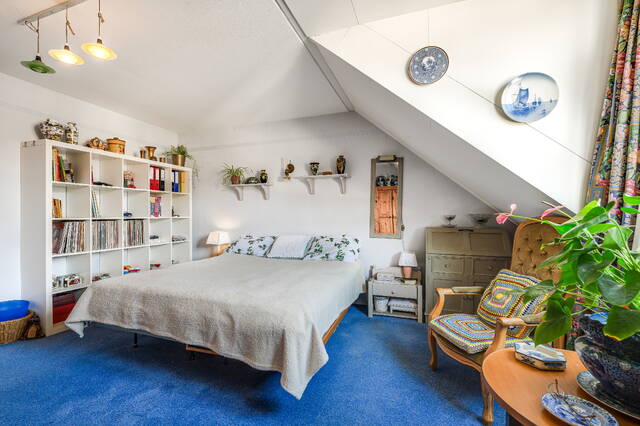 De overloop geeft toegang tot twee slaapkamers en de badkamer. De hoofdslaapkamer bevindt zich aan de achterzijde en is voorzien van een dakkapel met openslaande ramen. De tweede slaapkamer ligt aan de voorzijde van de woning. De ruime badkamer is volledig betegeld en uitgerust met een inloopdouche, ligbad met douche, toilet en wastafel met meubel.