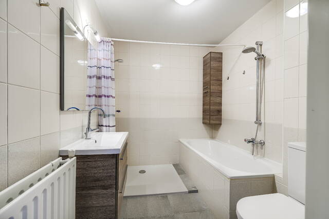 The landing provides access to two bedrooms and the bathroom. The master bedroom is located at the rear and features a dormer with opening windows. The second bedroom is located at the front of the house. The spacious bathroom is fully tiled and equipped with a walk-in shower, bathtub with shower, toilet, and washbasin with vanity unit.