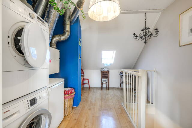 The second floor has a spacious landing (with small window) and the connections for the washing machine and dryer, as well as the mechanical ventilation system and central heating boiler. The bedroom features a spacious walk-in closet with a small window, providing extra daylight and natural ventilation.