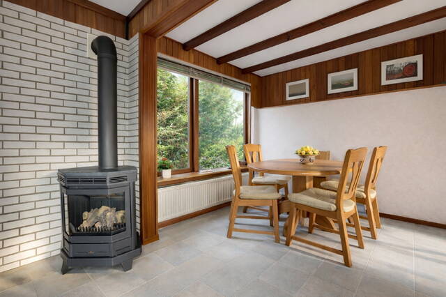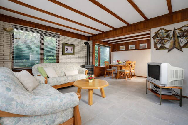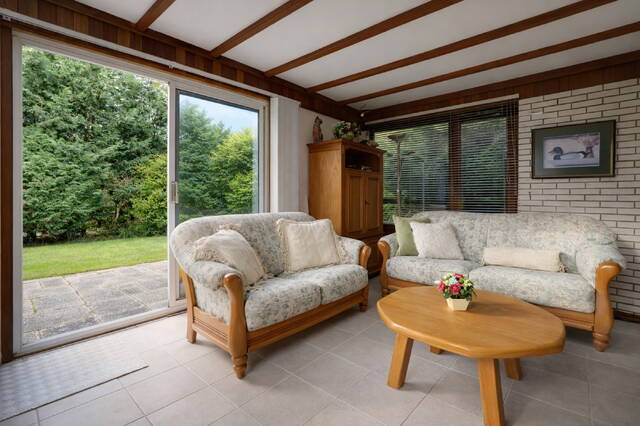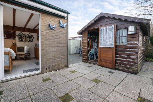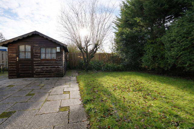 De woonruimte staat via een schuifpui in directe verbinding met de zonnige, groene tuin. In de tuin bevinden zich twee ruime schuren, wat zorgt voor voldoende opbergruimte.