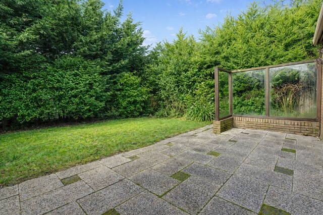 The living area is directly connected to the sunny, green garden through sliding doors. The garden features two spacious sheds, providing ample storage space.