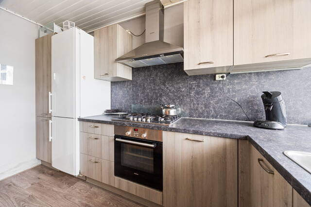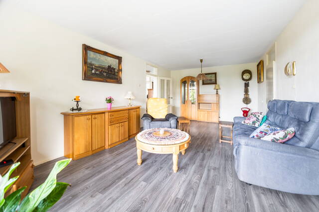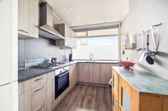 Through the entrance hall you enter the corridor. From here you have access to the kitchen (gallery side), bathroom, toilet (with wash basin), two bedrooms and the living room. The kitchen is equipped with a five-burner gas hob with extractor hood, oven, dishwasher (Siemens) and fridge-freezer combination. The bathroom has a shower, wash basin with cabinet and washing machine connection. The boiler is also located here. At the rear is the spacious and bright living room with adjoining dining room with built-in cupboards. Through a door and corridor from the living room you reach the third bedroom and a spacious storage room where the meter cupboard is located. From the living room, dining room and bedroom at the rear you have access to the sunny balcony across the full width.