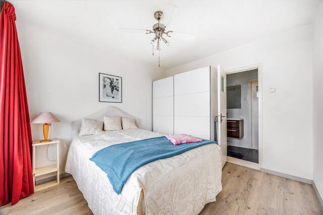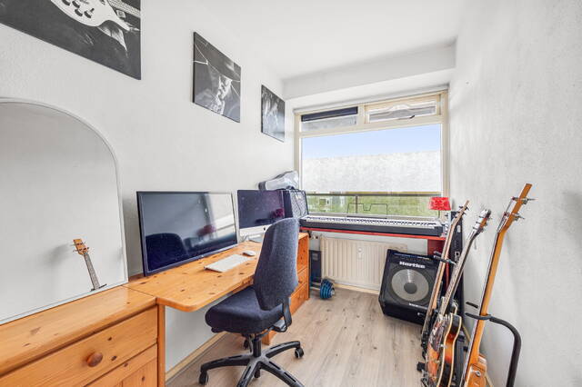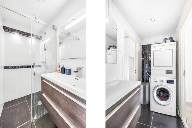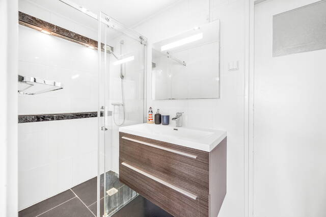 This well-maintained apartment is located on the sixth and top floor of a well-kept apartment complex. The spacious and sunny balcony with a beautiful view faces south.