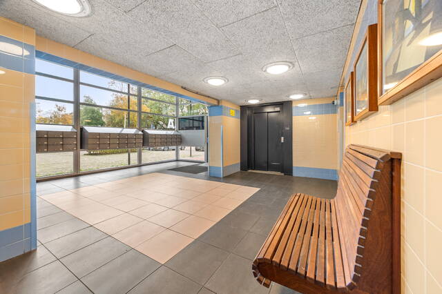 Central, secured entrance with mailboxes, video intercom system, and access to the indoor storage rooms. The sixth floor can be reached via the elevator or stairs.