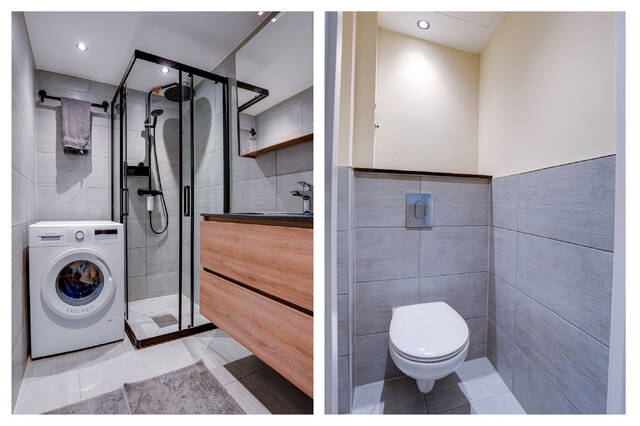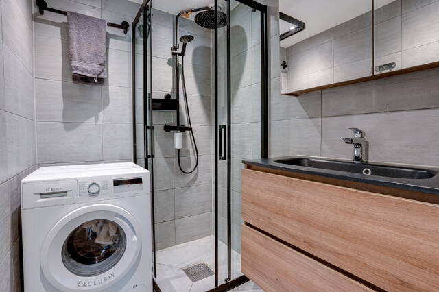 Badkamer: Moderne badkamer (2021) met douchecabine, wastafelmeubel en aansluiting voor wasmachine.