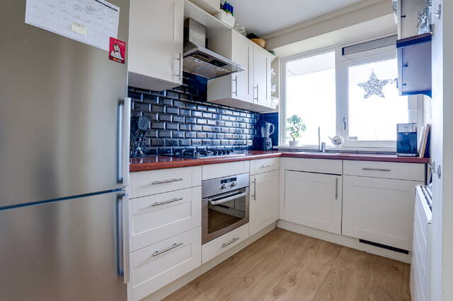 Keuken: Gesloten keuken aan de galerijzijde, voorzien van koelkast en vriezer (drie laden), vaatwasser, oven en vierpits gasfornuis met afzuigkap.