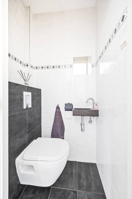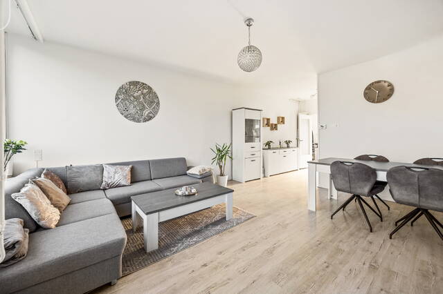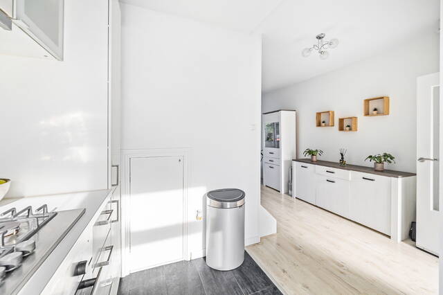 First floor: The front door of the house is located on the first floor, accessible via the gallery. Next to the front door is the meter cupboard with a modernized distribution board with 7 circuits. You enter the house into a hallway with a separate, modern toilet equipped with a wall-hung toilet and a small sink. The bright living room with dining area (approx. 24 m²) faces south and provides access to the front balcony. The open-plan kitchen (approx. 7 m²) is modern and equipped with a 5-burner gas stove with extractor hood, dishwasher, and oven. The fridge-freezer is separate.