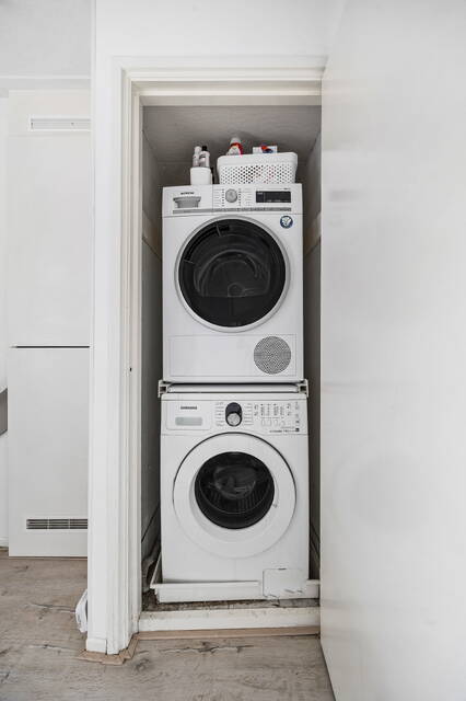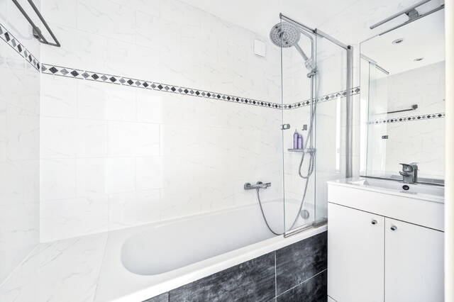 Second floor: The landing provides access to three bedrooms. The largest bedroom (approx. 11.5 m²) is located at the rear of the house and opens onto a spacious balcony spanning the entire width of the house. The two bedrooms at the front are approximately 9 m² and 6 m² respectively. The bathroom was renovated in 2019 and features a bathtub with shower and vanity. A built-in closet with connections for the washing machine and dryer, as well as the central heating system, is located on the landing.