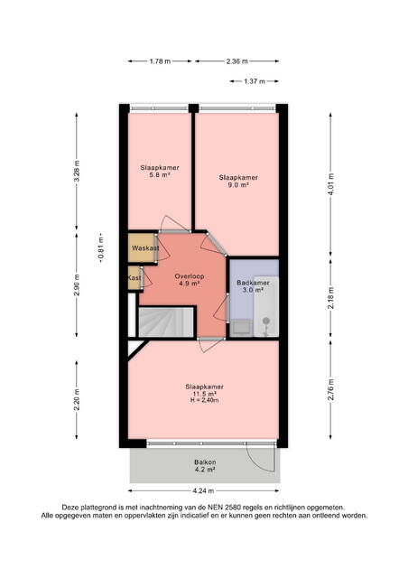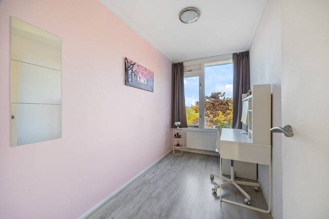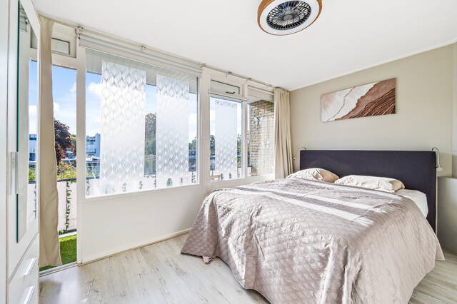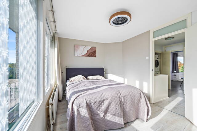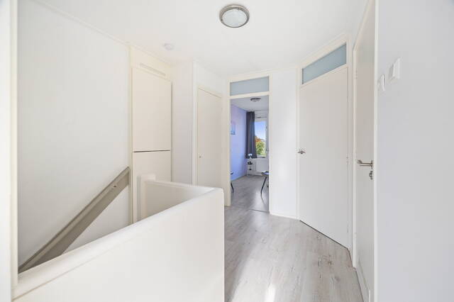De overloop biedt toegang tot drie slaapkamers. De grootste slaapkamer (ca. 11,5 m²) ligt aan de achterzijde en grenst aan een royaal balkon over de volle breedte. De twee slaapkamers aan de voorzijde zijn ca. 9 m² en 6 m². De badkamer is in 2019 vernieuwd en voorzien van ligbad met douche en wastafelmeubel. Op de overloop bevindt zich een vaste kast met wasmachine- en drogeraansluiting en de cv-installatie.