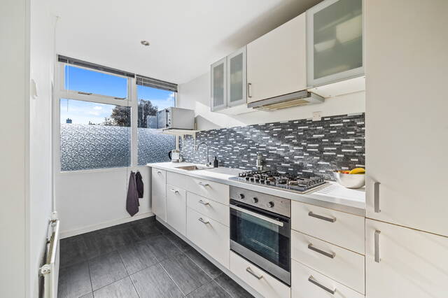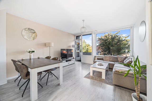 De voordeur van de woning is gelegen op de eerste verdieping, bereikbaar via de galerij. Naast de voordeur is de meterkast voorzien van een gemoderniseerde groepenkast met 7 groepen. Je betreedt de woning in een hal met een separaat, modern toilet voorzien van een wandcloset en een fonteintje. De lichte woonkamer met eetgedeelte (ca. 24 m²) ligt op het zuiden en geeft toegang tot het balkon aan de voorzijde. De open keuken (ca. 7 m²) is modern uitgevoerd en voorzien van een 5-pits gasfornuis met afzuigkap, vaatwasser en oven. De koelvriescombi staat los.