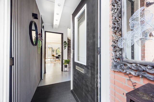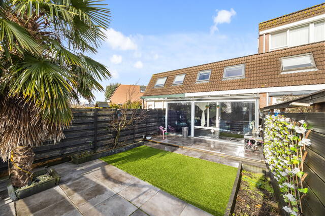 Deze modern en smaakvol ingerichte tussenwoning (1985) heeft een gebruiksoppervlakte van 85m² en ligt op een perceel van 123 m². De woonkamer en keuken beschikken over vloerverwarming. Over de volle breedte van de achtergevel bevindt zich een met schuifdeuren afsluitbare serre. De zonnige tuin biedt door haar ligging aan het water vrij uitzicht. Op de eerste verdieping bevinden zich 3 slaapkamers. De grootste slaapkamer is uitgerust met een airco unit