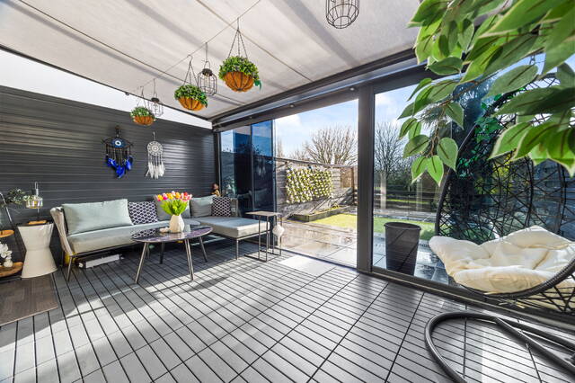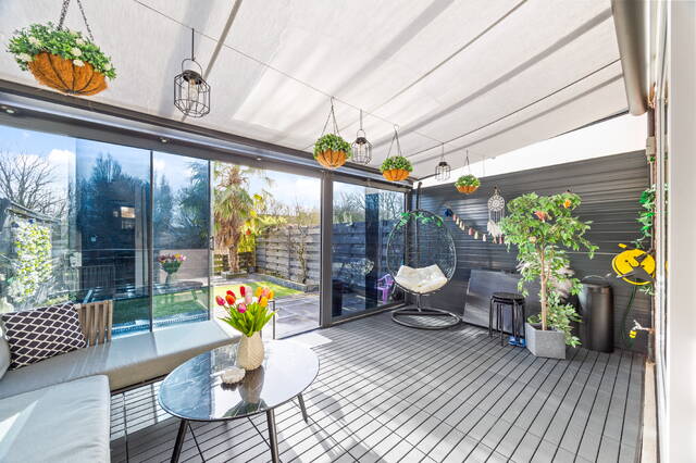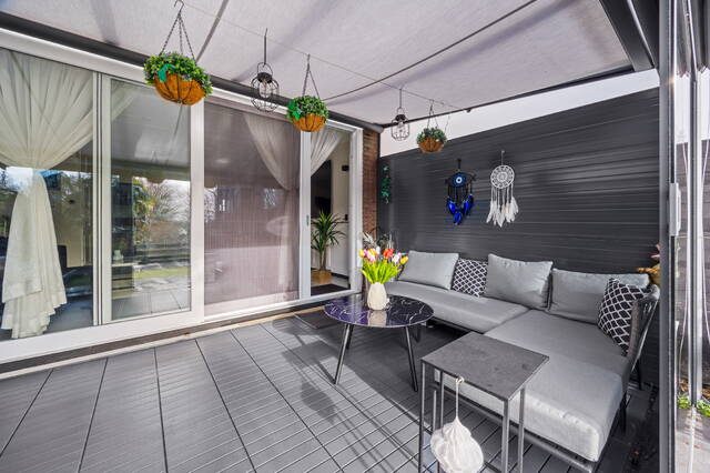 The covered entrance is reached through the neatly landscaped front garden, complete with a stone shed. The hall houses the storage room and a modern, tiled toilet with a hand basin. The spacious garden-facing living room (approx. m²) features an under-stairs cupboard and a door leading to the sunny, deep back garden. At the front of the house is the kitchen, equipped with composite countertops, a four-burner gas stove with extractor hood, oven, microwave, and dishwasher. The fridge/freezer is located in the stone shed. A sliding door leads to the enclosed serre (also with sliding doors and sun screen) and the spacious, partially tiled back garden. Facing southwest and overlooking the water, this is a wonderful place to relax!