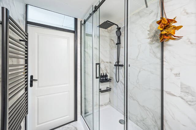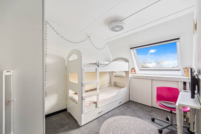 A closed wooden staircase leads to the landing. Three bedrooms are adjacent to this landing. The master bedroom, located at the front, measures 13m². This room has air conditioning and closet space. The other bedrooms, located at the rear, are 8m² and 5.5 m², respectively. Daylight is provided by two skylights with lockable insect screens. These bedrooms also have closet space. The modern bathroom, located between the two bedrooms, is equipped with a vanity with two taps, a wide illuminated mirror, a spacious shower enclosure, and a towel radiator. A cupboard for the central heating system, washing machine, and dryer is also located on the landing.