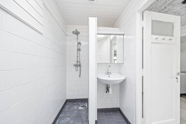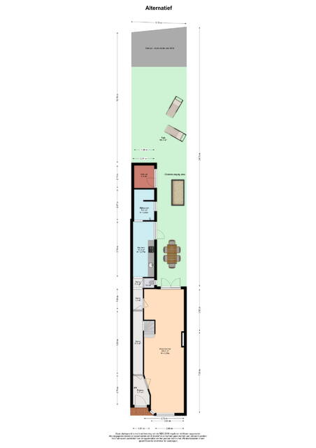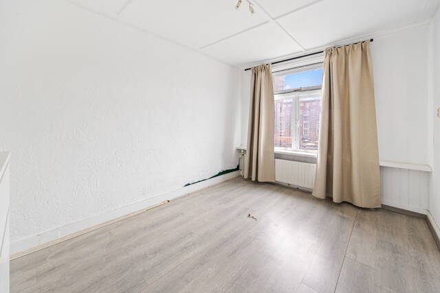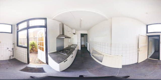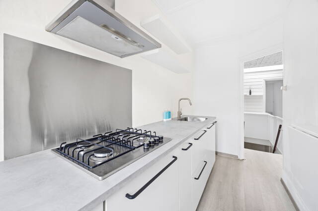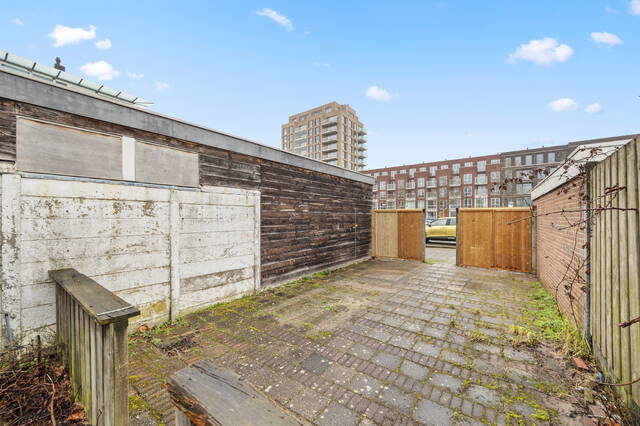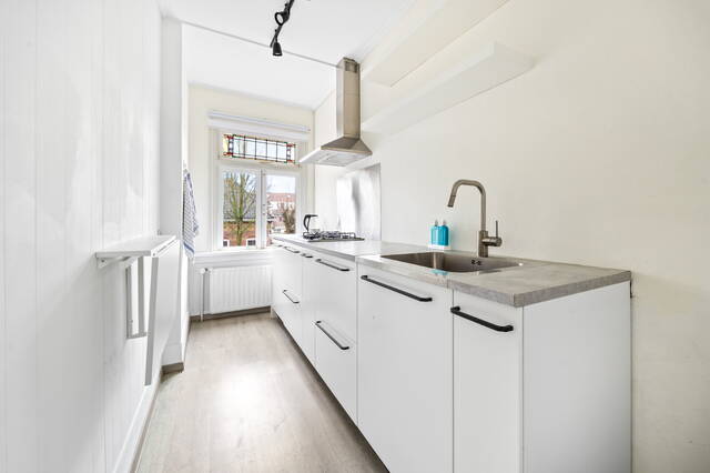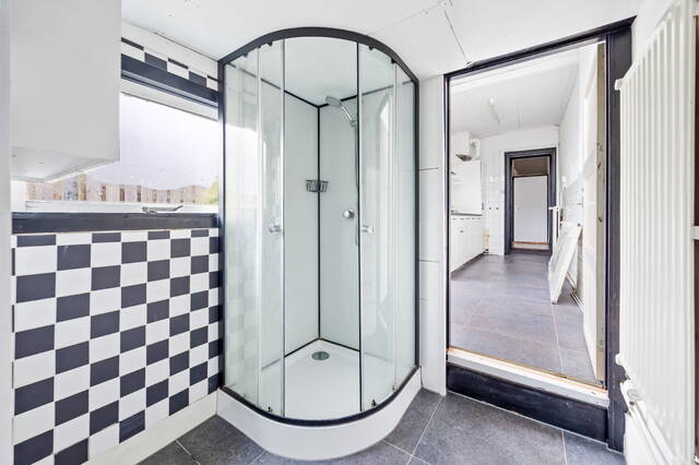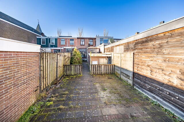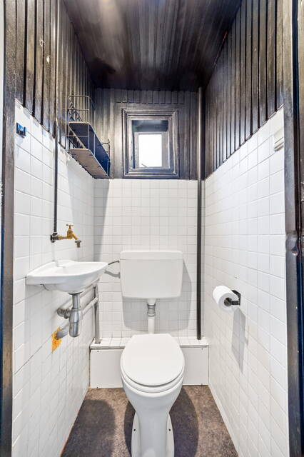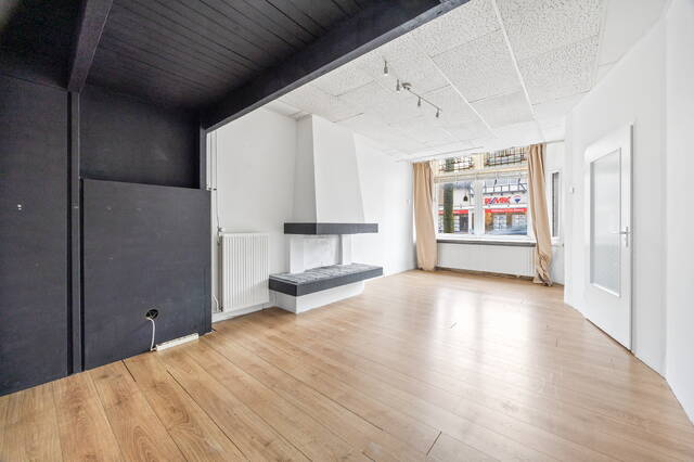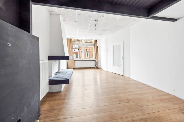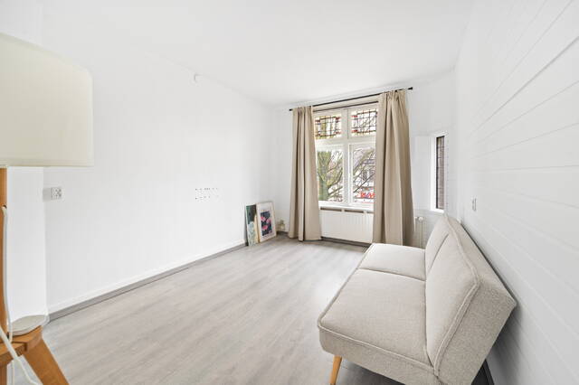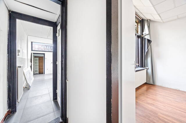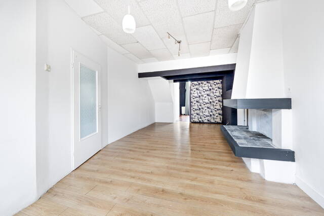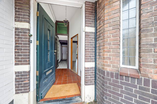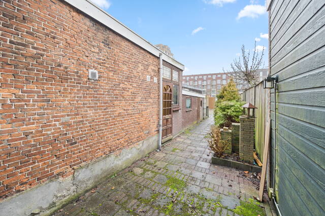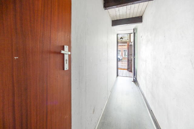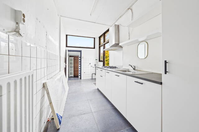 A vestibule leads to the 25m² living room, located on the street side. The ceiling height is 3.20 meters. At the rear is a separate room. The wall can easily be removed, creating a large living/dining room (39m²) with a view of the 96m² paved garden behind it. French doors provide access to the garden. The back room (future dining room) provides access to the toilet, kitchen, and utility room (currently used as a bathroom). The kitchen is partially equipped with built-in appliances. The Nefit central heating system is also located here. The utility room (with space for a washing machine) also provides access to the garden. A stone shed is also located in the east-facing garden.
