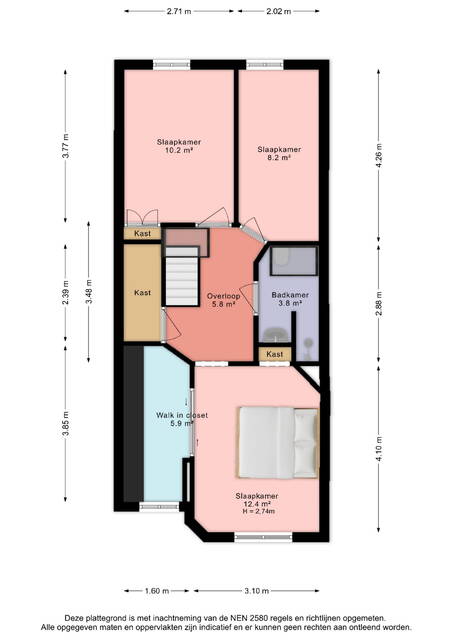 In de gang, gelegen in het verlengde van het tochtportaal ligt een dichte houten trap die uitkomt op de overloop van de tweede woonlaag. Hieraan grenzen een ruime inloopkast, een badkamer en drie slaapkamers. De achtergelegen slaapkamers hebben een afmeting van resp. 10m² en 8m². De grootste van deze 2 kamers heeft eveneens vaste kastruimte. De slaapkamer aan de voorzijde heeft een oppervlakte van 12.4 m² en beschikt over een inbouwkast. Plafondhoogte is 2.74 meter. De thans naast deze slaapkamer gelegen keuken kan als ‘walk in closet bij de slaapkamer worden getrokken. De badkamer (4m²), is voorzien van een inloopdouche (rainshower), wastafel met spiegelkast, toilet en wasmachine aansluiting; twee lichtkoepels ter hoogte van de overloop en badkamer zorgen voor extra lichtinval.