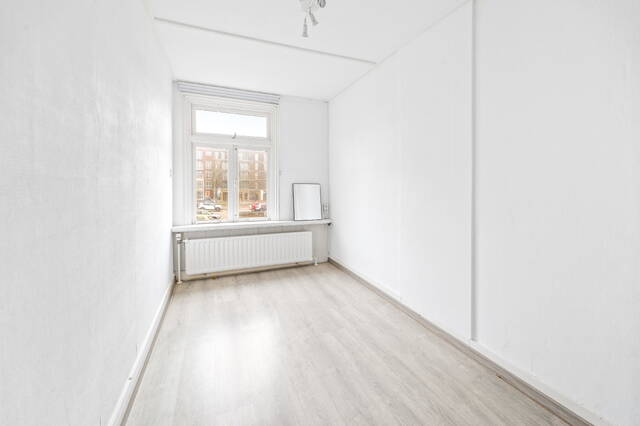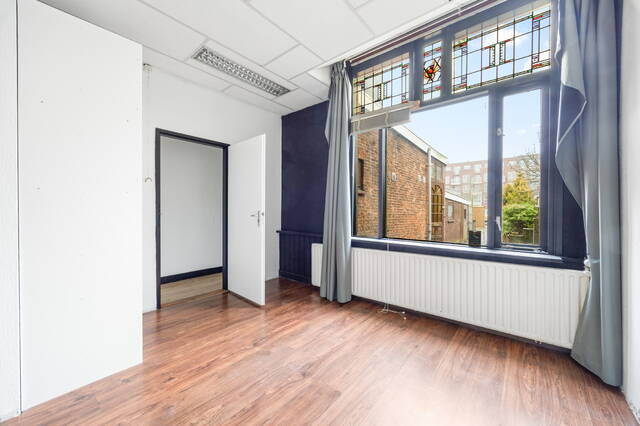 Via een tochtportaal wordt toegang verkregen tot de aan straatzijde gelegen woonkamer van 25m². Plafondhoogte bedraagt 3.20 meter. Aan de achterzijde ligt een aparte kamer. De wand hiervan is eenvoudig te verwijderen, waardoor er een grote woon-/eetkamer (39m²) ontstaat met zicht op de achtergelegen betegelde tuin van maar liefst 96m². De tuin kan worden ontsloten door openslaande deuren. Via de achterkamer (toekomstige eetkamer) wordt toilet, keuken en bijkeuken (thans in gebruik als badkamer) bereikt. De keuken beschikt deels over inbouwapparatuur. Hier bevindt zich ook de Nefit cv installatie. Vanuit de bijkeuken (met opstelmogelijkheid voor wasmachine) wordt eveneens toegang verkregen tot de tuin. In de tuin (oost-ligging) bevindt zich nog een stenen berging.