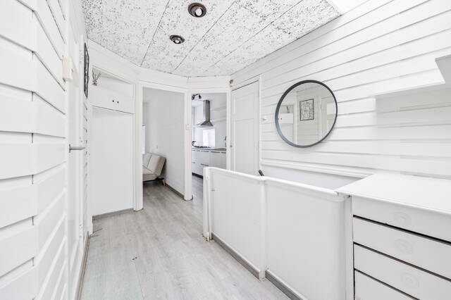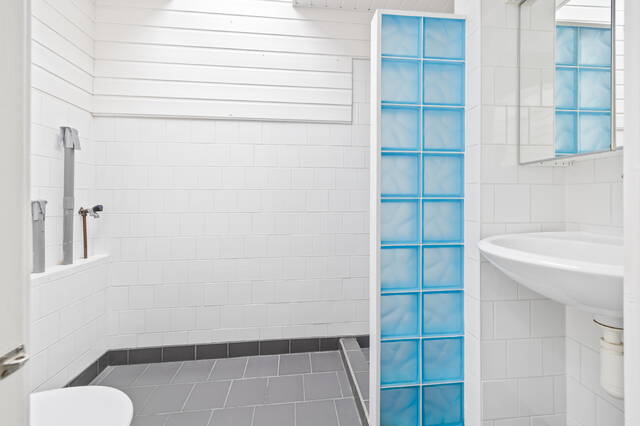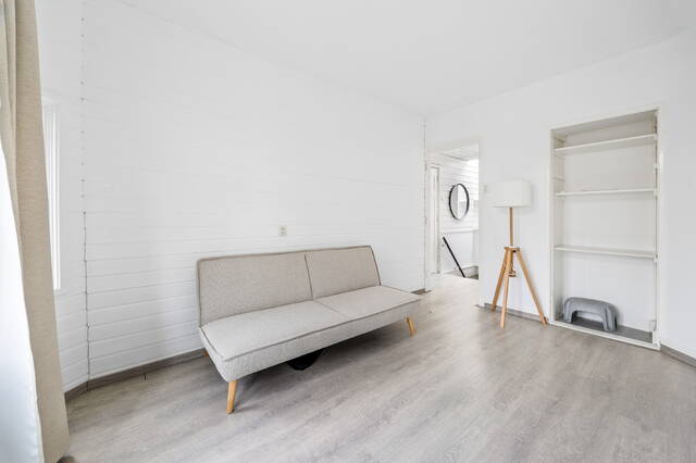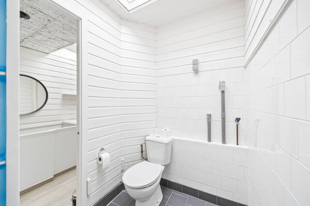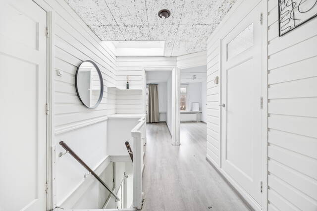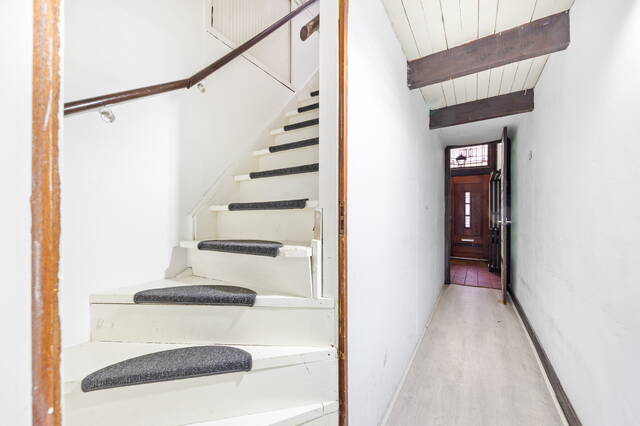In the hallway, extending from the vestibule, is a closed wooden staircase leading to the landing of the second floor. Adjacent to this landing is a spacious walk-in closet, a bathroom, and three bedrooms. The rear bedrooms measure 10m² and 8m² respectively. The larger of these two rooms also has built-in closet space. The front bedroom measures 12.4m² and features a built-in closet. The ceiling height is 2.74 meters. The kitchen, currently adjacent to this bedroom, could be integrated into the bedroom as a walk-in closet. The bathroom (4m²) features a walk-in shower (rain shower), a vanity with a mirrored cabinet, a toilet, and a washing machine connection. Two skylights above the landing and bathroom provide additional natural light.