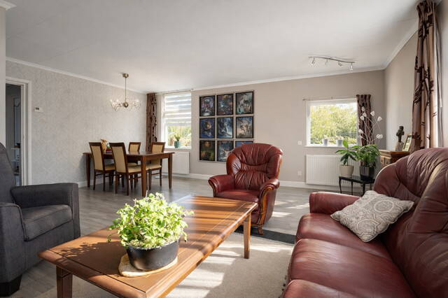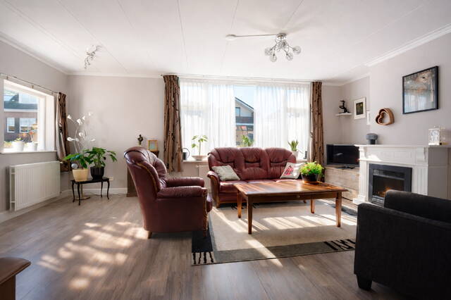 De lichte woonkamer aan de voorzijde biedt een prettige leefruimte met veel daglicht en vrij uitzicht op het voorgelegen water.