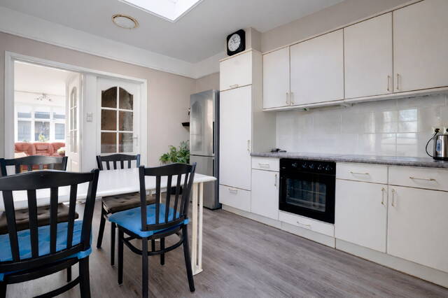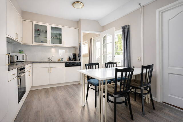 Through the charming yard, you reach the entrance. The kitchen-diner features an L-shaped kitchen in a light color scheme, equipped with various built-in appliances and enough space for a dining table.
