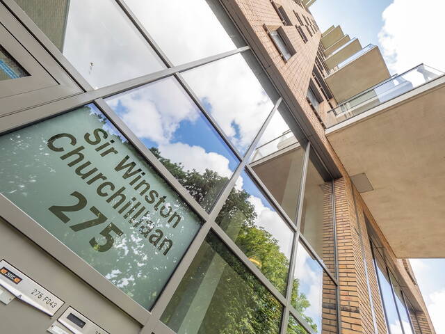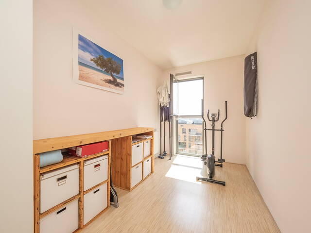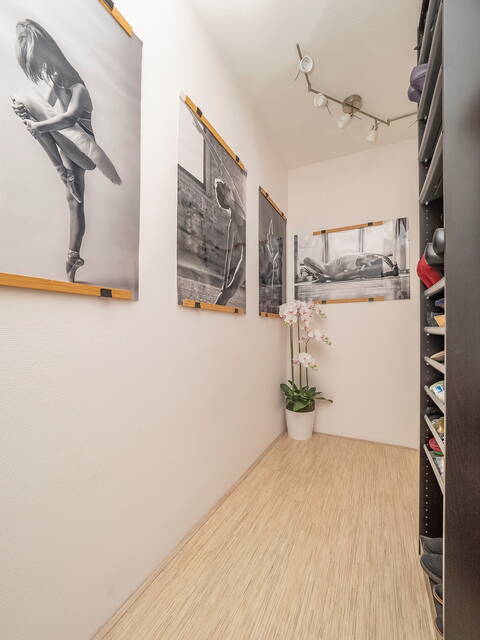 Access to the complex is via the secure central entrance. Two elevators are located here, serving the 16 floor. The doorbell panel is equipped with a video camera. The private storage unit (5.14 m²) is located on the first floor, and the parking garage is located in the basement. The communal courtyard garden is accessible from the second floor.