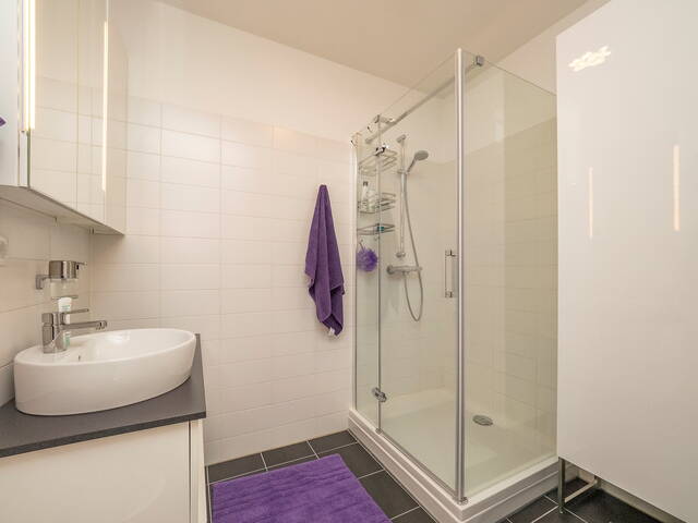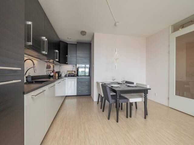 The elevator opens onto a spacious, carpeted covered hallway. The apartment's front door opens into an L-shaped hall equipped with a video intercom, meter cupboard, and laundry/central heating room. In addition to the Intergas central heating system (2015), there is ample space for a washing machine and dryer. The modern bathroom (4.5 m²) is located between the two floors and is equipped with a shower and a vanity unit. The separate toilet room has a wall-hung toilet and a small sink. The spacious and bright living room with open kitchen (approximately 40m²) is equipped with built-in appliances, including a four-burner induction cooktop, dishwasher, self-cleaning oven, refrigerator, and four-drawer freezer. The 9m² southwest-facing balcony offers expansive views, including the Rotterdam skyline, the Nieuwe Waterweg harbor area, Delft, and The Hague Southwest. The two adjacent bedrooms are 12.5m² and 9.0m² respectively.