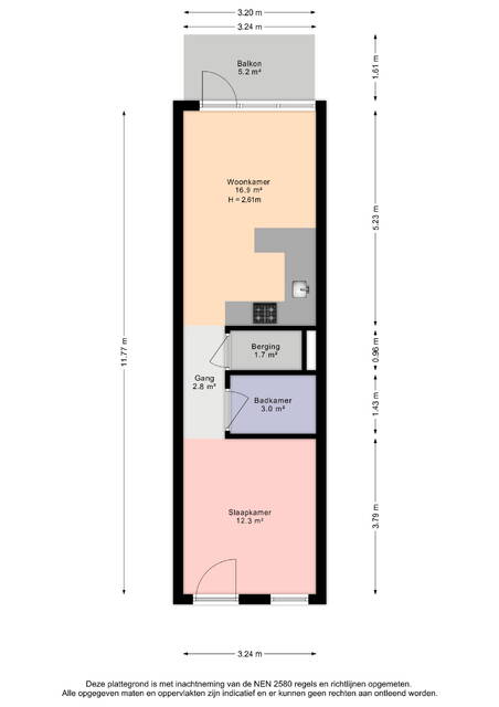 Entree, slaapgedeelte, woongedeelte met moderne open keuken, voorzien van vier pits gasfornuis met afzuigkap, koelkast, vaatwasser en combimagnetron. Verder zijn er voldoende boven- en onderkasten aanwezig. Vanuit het woonkamer gedeelte is er toegang tot een balkon (ca. 3.25m² bij 1,50m²). De studio beschikt verder over een nette badkamer, uitgerust met wastafel, douche, toilet en opstelplaats voor wasmachine/droger. Daarnaast is er een inpandige bergruimte waar zich eveneens de groepenkast, cv- en mv-installatie bevindt.