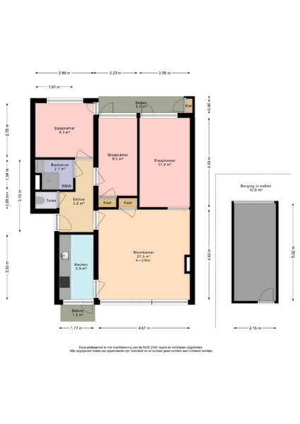 Dit appartement van 71m2 bevindt zich op de tweede verdieping van een kleinschalig appartementencomplex. Het heeft een ruime woonkamer, een keuken aan de voorzijde, 3 slaapkamers, een toilet, badkamer, twee balkons en een zeer ruime berging in de onderbouw.