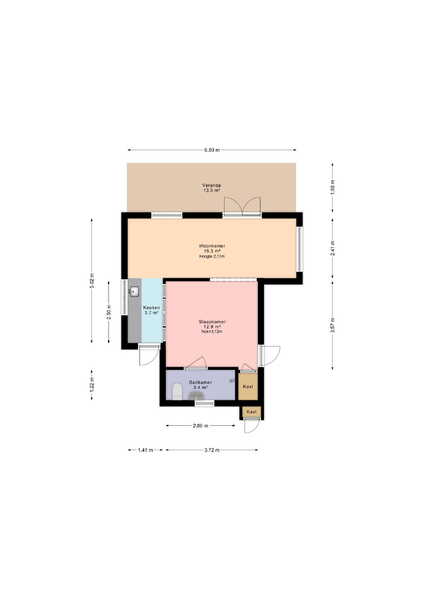 Dit object wordt nu gebruikt als atelier. Bij binnenkomst komt u in een ruimte waar u een slaapkamer van kunt maken. Vanuit deze ruimte heeft u toegang tot de badkamer. Deze is uitgerust met een toilet en een vaste wastafel. Als u doorloopt komt u in het woongedeelte, wat toegang geeft tot de keuken en de tuin. De keuken beschikt over een gootsteen, koelkast en magnetron.